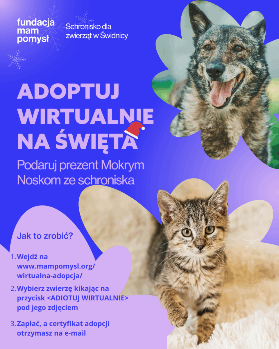 Do 24 grudnia trwa wirtualna adopcja świąteczna. To jednorazowe wsparcie wybranego psa lub kota, zakończone automatycznym certyfikatem online. To piękny, symboliczny prezent dla siebie lub bliskiej osoby.