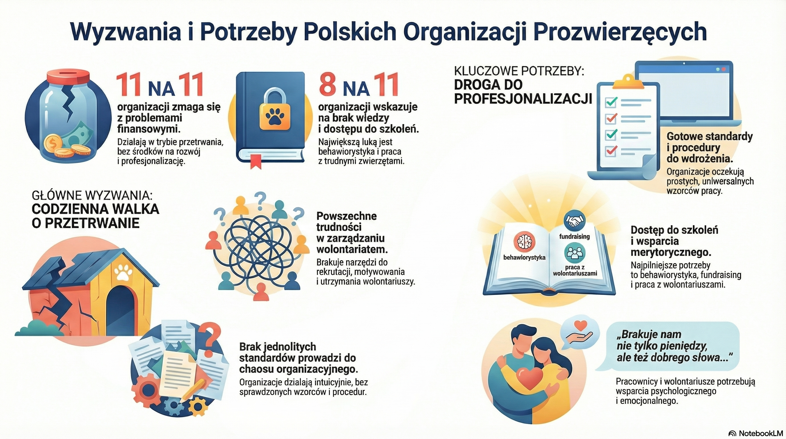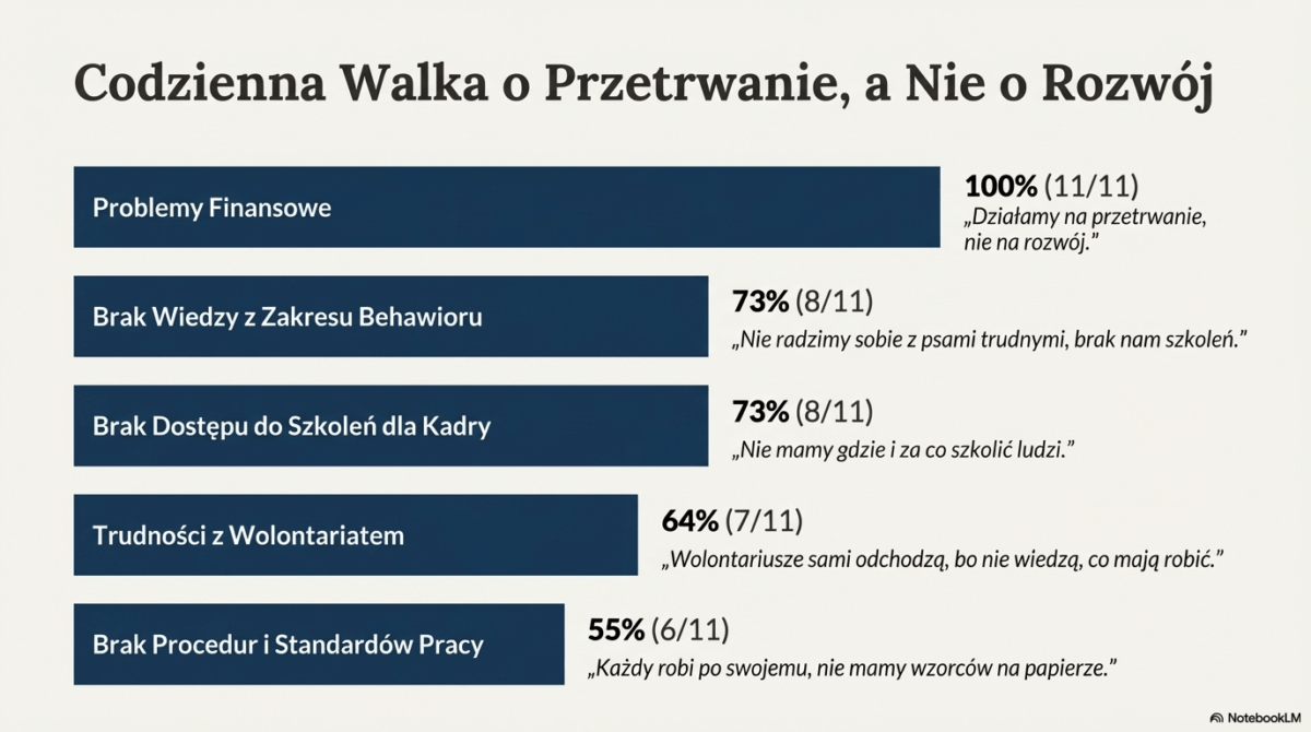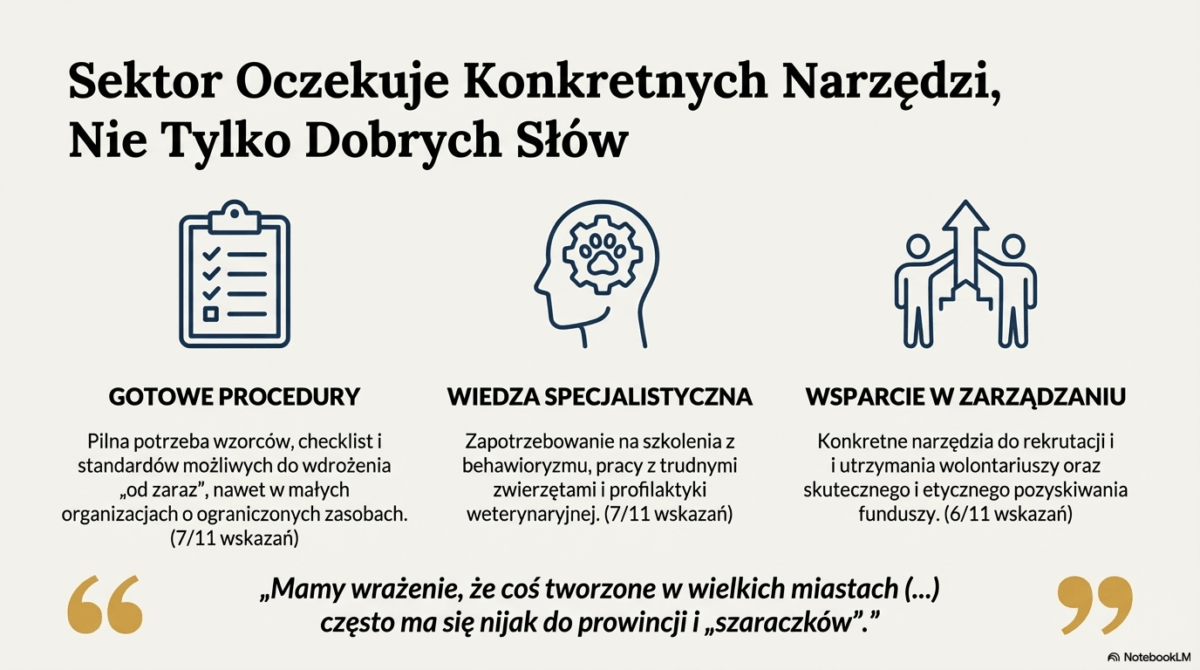 Zebrany materiał badawczy ujawnił skalę problemów systemowych, z jakimi mierzą się organizacje działające na rzecz zwierząt. Jednym z najczęściej powtarzających się wątków był brak spójnych standardów i procedur pracy: