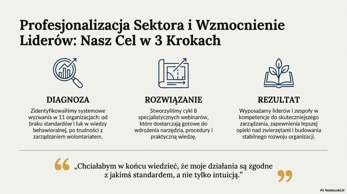Projekt stanowi odpowiedź na realne, jasno zdefiniowane potrzeby środowiska i jest krokiem w stronę systemowego wzmocnienia organizacji działających na rzecz zwierząt w Polsce.