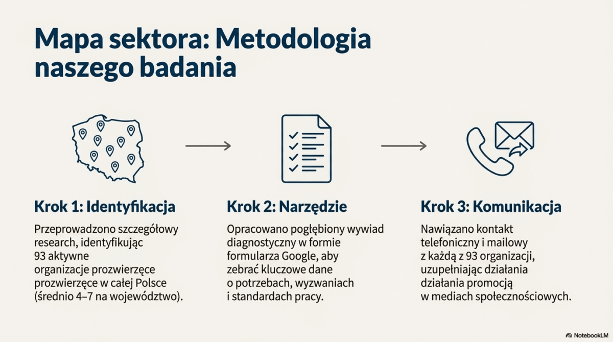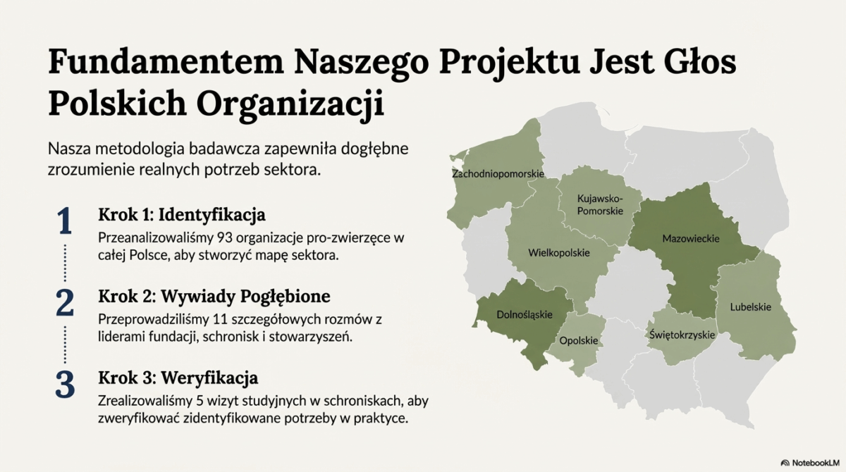 Pierwszym etapem projektu była ogólnopolska diagnoza sytuacji organizacji prozwierzęcych. W ramach działań zidentyfikowano 93 organizacje z różnych województw oraz nawiązano z nimi bezpośredni kontakt telefoniczny i mailowy. Organizacje zaproszono do udziału w pogłębionym wywiadzie diagnostycznym, którego celem było zebranie danych dotyczących realnych wyzwań, potrzeb i barier w codziennej pracy.