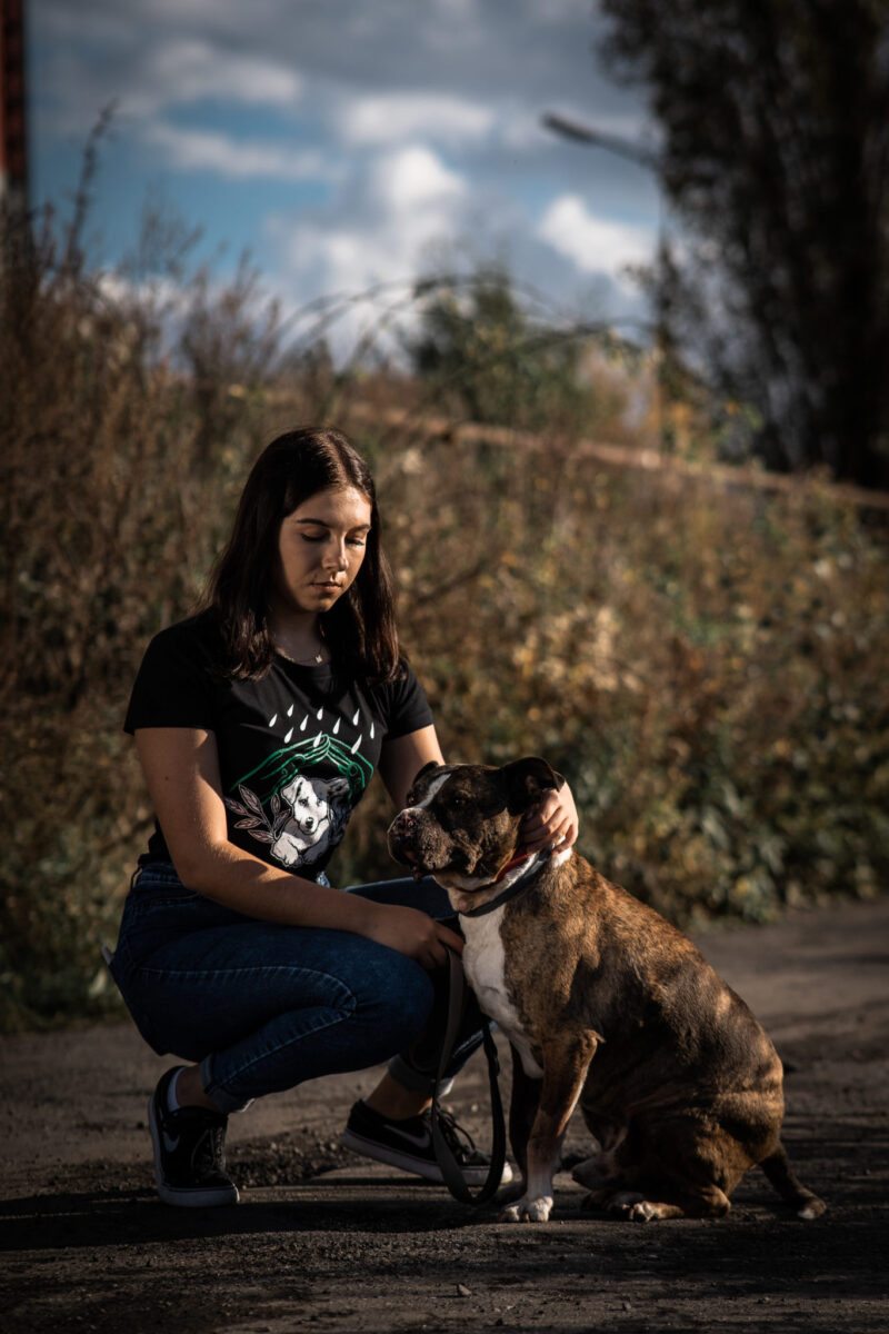 Produkt wykonany w 100% z bawełny. Koszulka czarna z nadrukiem dwustronnym: przód – piesek, tył – logo.