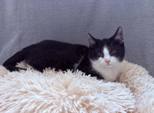 Młoda kotka, która uwielbia bliskość, głaski i chętnie towarzyszy w codziennych czynnościach. Ma około 6 miesięcy.